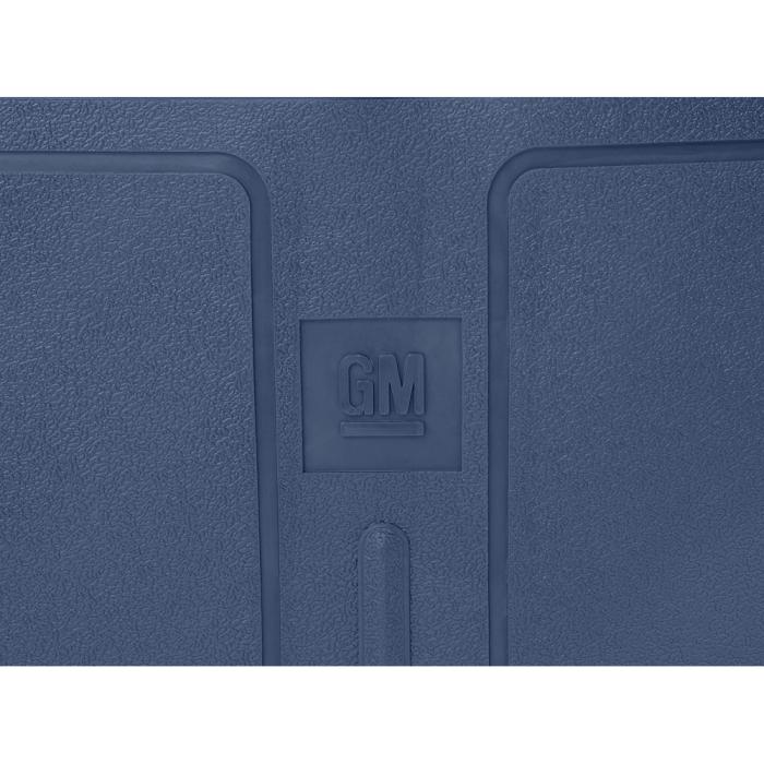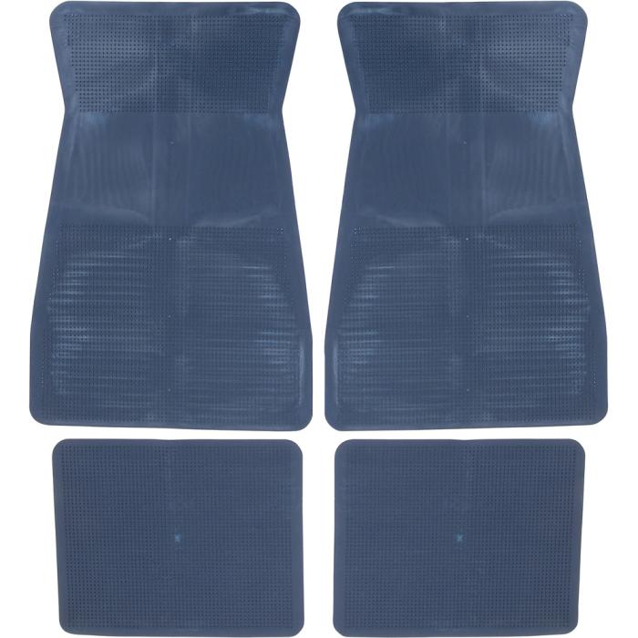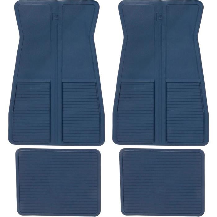 Reproduction of the original style rubber floor mats designed for use with various 1973-87 models including Camaro, Firebird, Impala, Bel Air, Biscayne, Nova, and other GM models. Manufactured from automotive grade rubber to factory specifications and die-cut to fit the original contour of the floor pan. Features a GM logo on the front mats, the correct textures, color and anti-slip carpet grippers on the bottom. Sold as a 4 piece set with 2 front and 2 rear mats.
