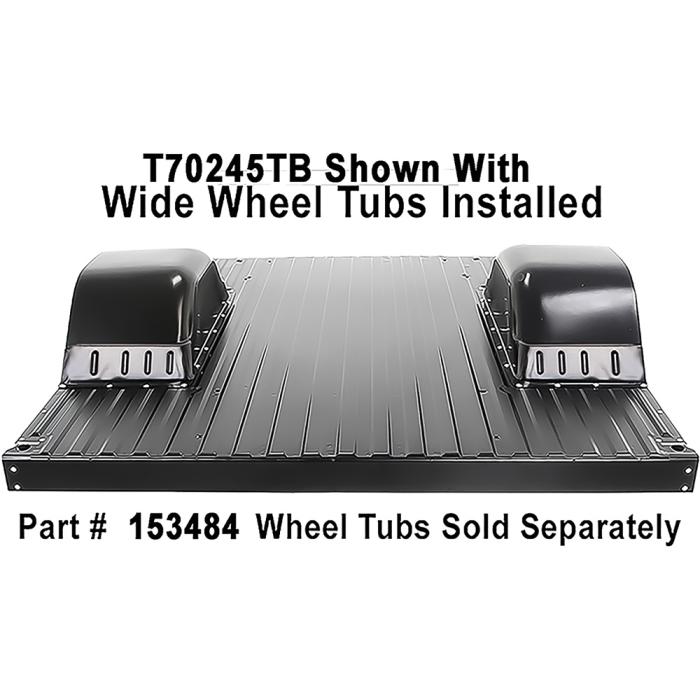 Tubbed full bed floor panel for 1973-86 Chevrolet and GMC Fleetside Pickups, and 1987-91 Fleetside crew cab and dually models. Manufactured in quality stamped steel to accommodate wider 16 inch bolt-in wheel tubs (sold separately). This full bed floor assembly is Ideal when you need to replace a floor panel that is damaged beyond repair and you need additional clearance for the rear wheels.Features heavy gauge steel, manufactured with our exclusive premier robotic welding assembly process and pre-installed bed floor braces. Comes finished in black EDP coating for rust and corrosion prevention. Bolt-on wider wheel tubs are available separately. Refer to part number # 153484.