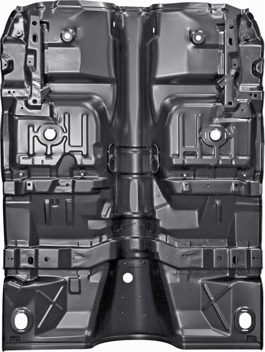Reproduction of the original floor pan assembly designed for use with 1975-1981 Camaro and Firebird models equipped with an automatic transmission. This complete floor pan is manufactured in stamped steel to OE factory specifications, accurately replicating the original design and fitment. Features factory-style contours, pre-punched drain holes, correct stiffening ribs, and all underside bracing for strength and authenticity. Finished in black EDP coating for rust and corrosion prevention.