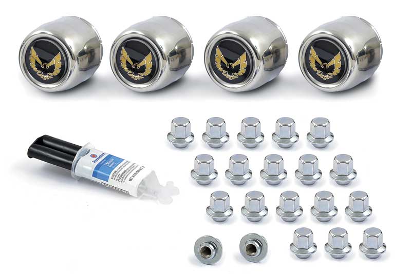 Reproduction stainless steel wheel center cap, emblem and lug nut kit for 1977-81 Pontiac Firebird models with snowflake wheels. This kit includes 4 stainless steel caps, 4 gold Firebird emblems, 20 factory style 7/16"-20 lug nuts, and 1 tube of epoxy cement to adhere the emblems to the caps.