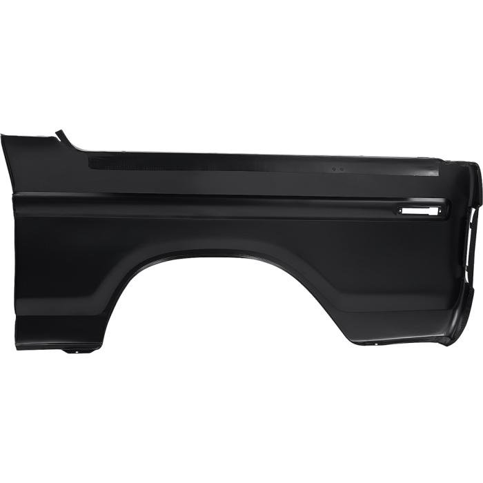Reproduction outer bedside quarter panel skin for 1978-79 Ford Bronco models. Each quarter panel skin is manufactured in 19 gauge stamped steel featuring the correct shape, size, length matching the OE Ford panel. Includes a pre-cut opening for the rear side marker lamp. Comes in a black EDP coating for rust and corrosion prevention. For use on the RH passenger side.