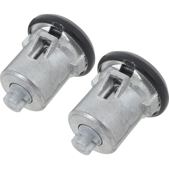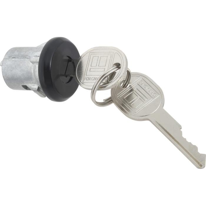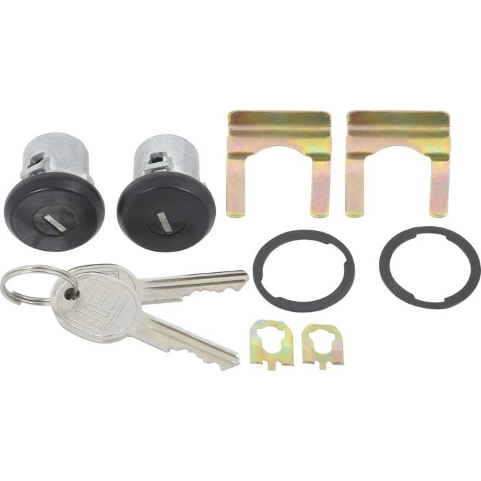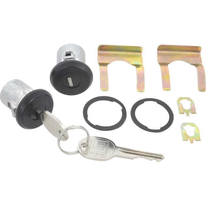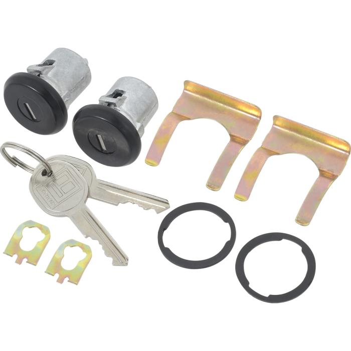 Reproduction door lock cylinders for various 1961-87 Buick, Cadillac, Chevrolet, Pontiac, and Oldsmobile models as listed. Includes two door lock cylinders with black face finish, two generic logo keys, cylinder retainers, and gaskets for a complete replacement. NOTE: Check lock pawl shaft length on your original door lock before ordering, this lock features the short style shaft.