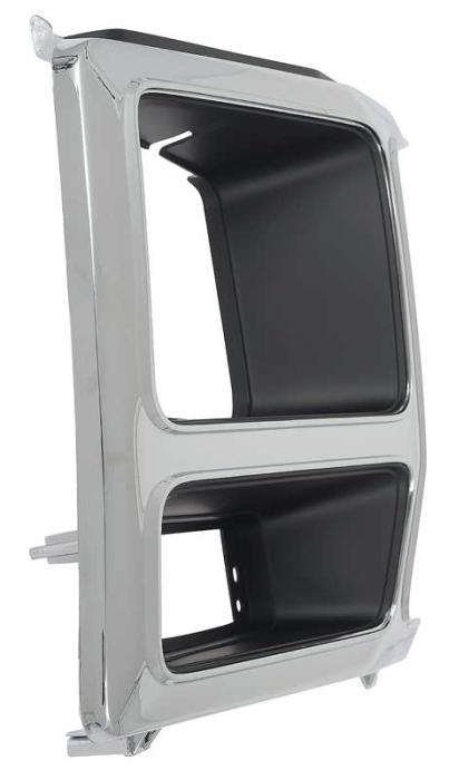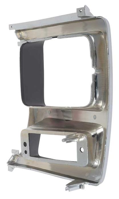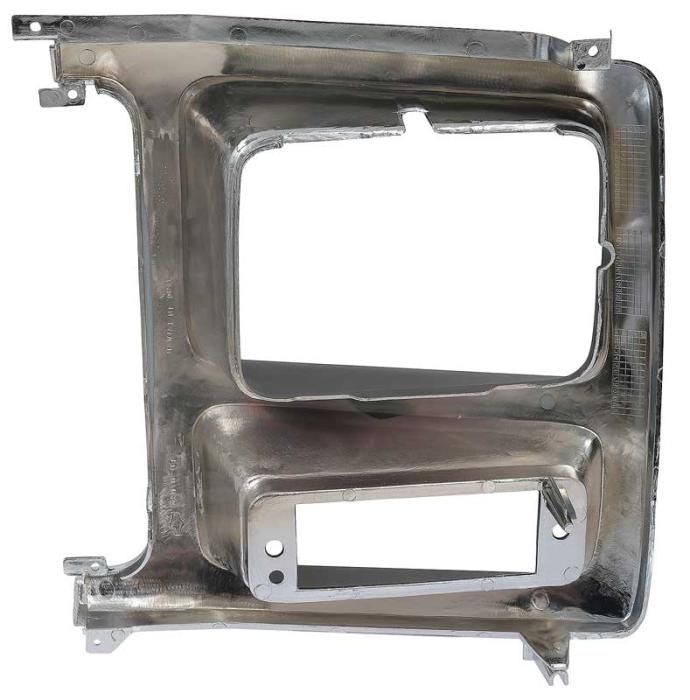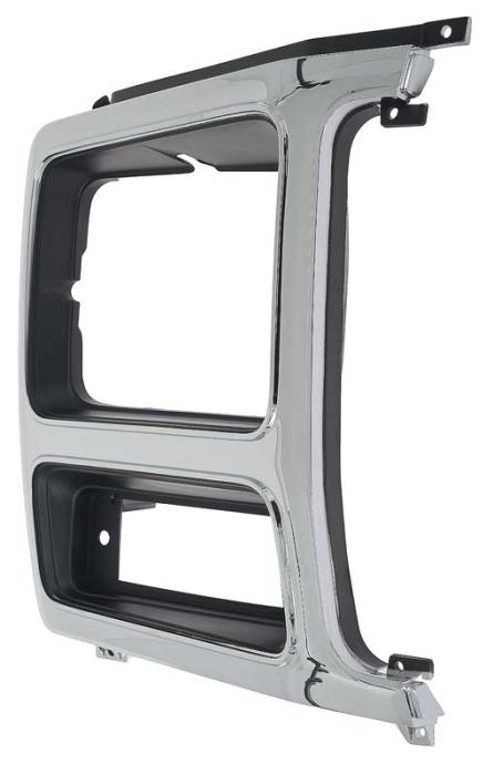Reproduction of the original headlamp bezel for 1980-86 Ford F150, F250, and F350 pickups, and Bronco models with rectangular headlights. Manufactured in injection-molded plastic to correct factory configuration featuring pre-drilled mounting locations. This bezel comes in chrome and black finish. For the RH, passenger side.