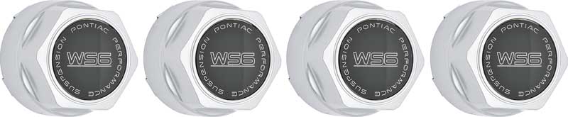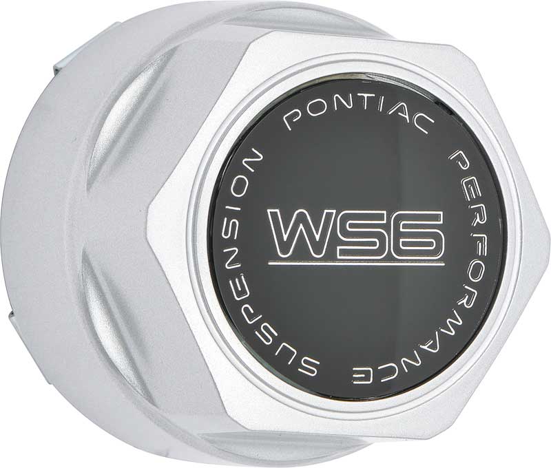 Reproduction wheel center hub cap for 1982-92 Pontiac Firebird Trans Am and Fotmula models with the WS6 performance package. This silver plastic cap has the metal clip attached and features a black center with the "WS6 Performance Suspension" logo. Can be used on 1982-92 models. Sold as a set of 4.