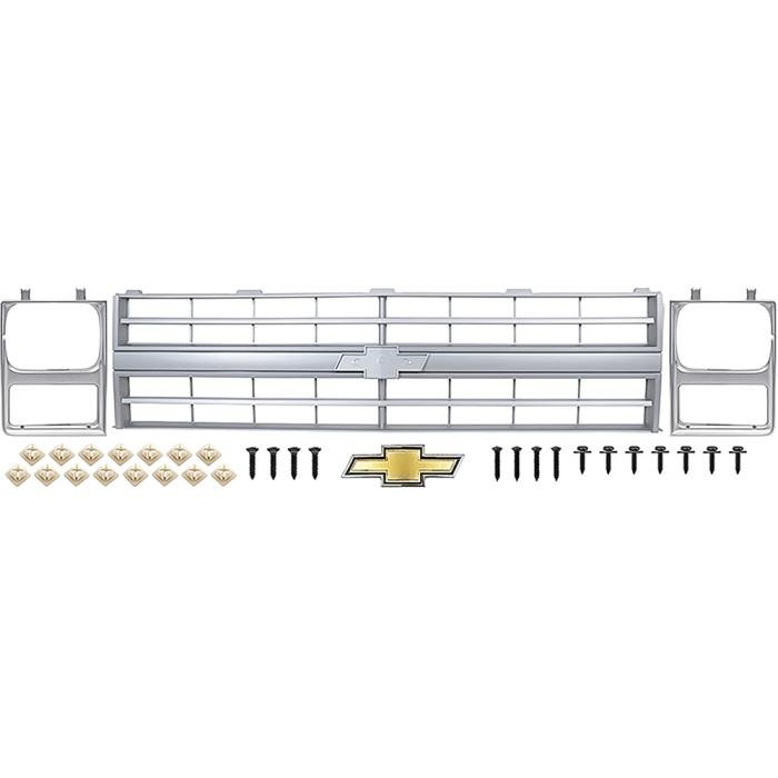 Give your 1985-86 C/K and 1987-88 R/V Chevy models with single headlamps a facelift with our convenient replacement grill and headlamp bezel set. This basic set includes the 1 center grill, 2 headlamp bezels for single headlamps, headlamp bezel screws, nylon mounting nuts, grill mounting bolts, and 1 Bow Tie emblem with spacers.