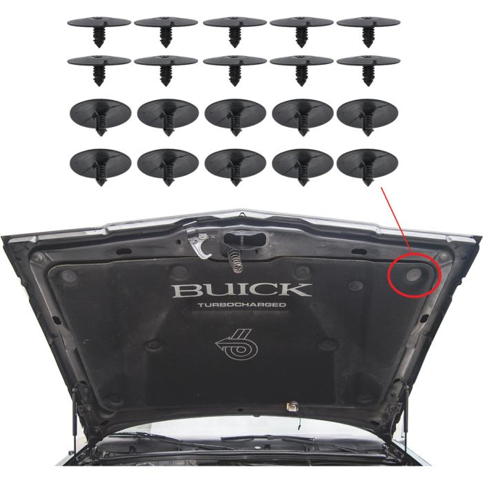 Replacement black nylon 1-3/4" hood insulation retainer is just what your GM vehicle needs to keep your original hood insulation where it belongs... attached to the hood. This retainer is a service replacement for most models prior to 1971 and stock replacement for most 1971-02 models that require a plastic retainer. It may differ cosmetically from the original retainer but will fit and function properly on most GM vehicles. Replaces GM part # 20064875. Sold as a bulk pack of 20 pieces, or order individually using part # A1015. Specifications: