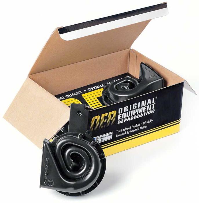 Quality reproduction of the original horn assembly designed for use with various 1958-96 Buick, Chevrolet, Oldsmobile, and Pontiac models. Each horn is manufactured to factory specifications replicaing the original in quality, fitment and design. Features correct semi-gloss black "swirl" shaped housings, with "Delco-Remy" words in the original font. This horn assembly comes complete with a low note, and high note horns featuring universal mounting brackets that can be adapted to most GM vehicles.