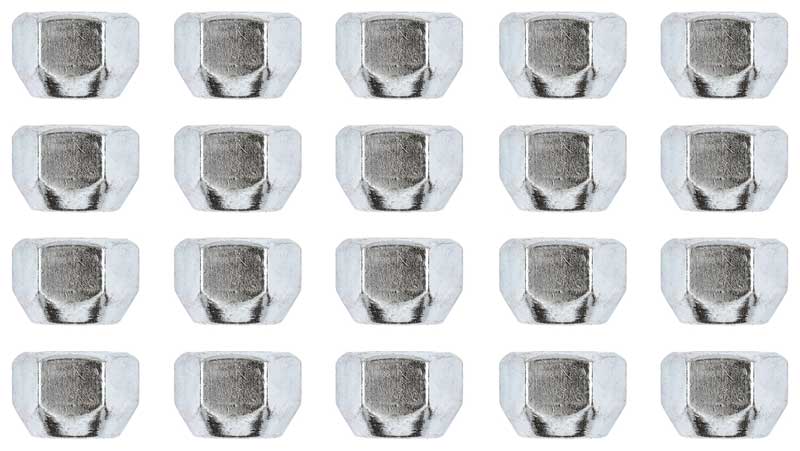 Standard lug nut set for 1971-76 Chrysler, Dodge, and Plymouth models with standard wheels and hub caps. Each lug nut is zinc plated and features a 3/4" hex for dependable service and easy installation. Sold as a set of 20.