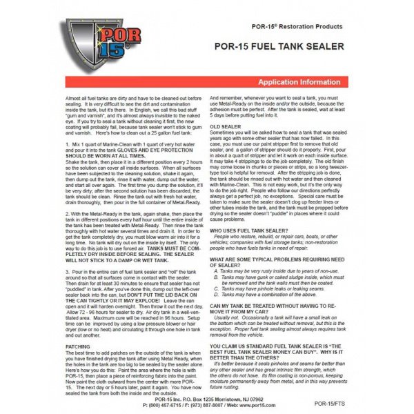 POR-15® Fuel Tank Sealer was formulated and developed their own laboratories due to the demand for a high-tech sealer impervious to all fuels, including the new Stage II fuels which have a high alcohol content. POR-15® Fuel Tank Sealer has superior strength and fuel resistance, and does not contain Methyl Ethyl Ketone, a highly flammable and deadly carcinogen (cancer-causing). POR-15® Fuel Tank Sealer is non-flammable and is environmentally safe.