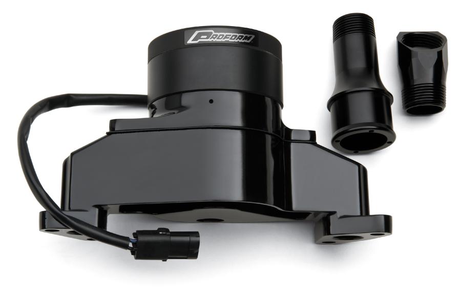This electric engine water pump fits Small Block Ford engines and is made from high-quality die cast aluminum. Features a great looking black powder coat finish. Unit has a flow rate of 35 GPM and only draws 6 amps. It includes a billet aluminum material 1.0 inch NPT to 1-3/4 inch hose fitting. Backing plate and weather-tight connectors are also included. Sold individually. Backed by a limited 30 day factory warranty.