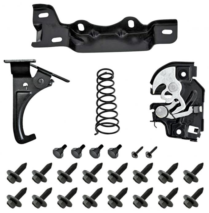 This hood installation set includes original style components for an OE appearance. Set includes hood latch and bracket, hood safety catch, hood pop spring, attachment hardware including hood strut bolts. Components feature a durable EDP coating for corrosion resistance.