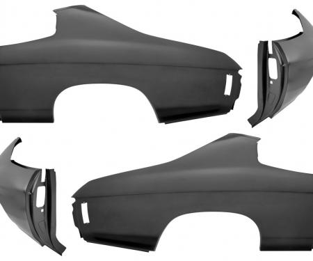 These panels are located on the front fender behind the wheel well. They are stamped steel, not hand-formed. These are a less expensive replacement that includes a brace in the front lower corner, but not a rear brace and does not include the bodyline and is made of a thinner gauge steel.