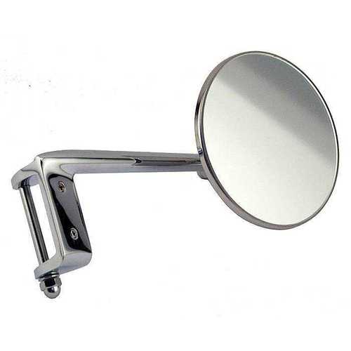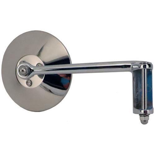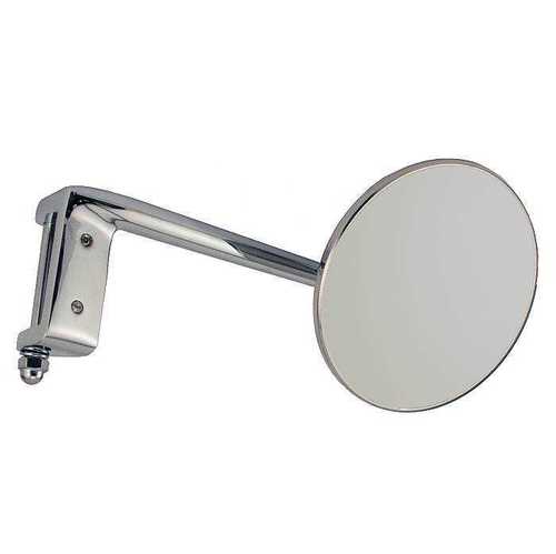 Similar to our A-17741-A hinge mirror except this one has an offset arm. 1.700" is the width where it slips over the top and bottom of the hinge. Chrome arm with a 4" polished stainless mirror head. Longer hinge pin included. Pin is .235" diameter. Right side.