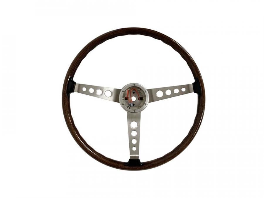 Scott Drake's stunning replica of the wood-rimmed Shelby GT350/500 steering wheel has been wildly popular and has found its way onto many different cars. As the original Shelby steering wheels were made using Mahogany wood, they did not perfectly complement the darker walnut used in 1965-66 Pony interiors, 1968 Deluxe interior, and the 1969-73 Mach 1 and Grande interiors. It features a beautifully finished, solid, genuine wood rim with the proper finger indentations and a distinctive black band around the back surface, just like the originals. The sporty 3-spoke design is made from brushed stainless steel with 4 chamfered holes per spoke and unique black rubber finger guards. The main hub is CNC-machined aluminum with a satin finish. Each wheel is equipped with an integrated 65-73 mounting hub. Concours correct 1967-68 GT350 and GT500 horn button assemblies are available separately, as well as 1965-66 Shelby, Mustang, and Mach 1 horn buttons.
