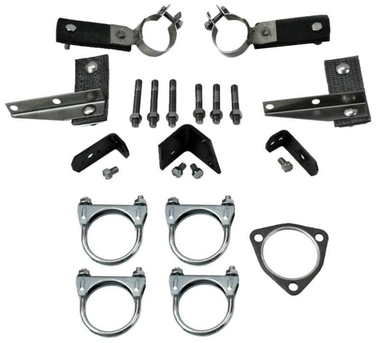 Kit includes heat riser gasket, 3 left and right manifold studs, right muffler bracket, 2 muffler supports, 2 1-7/8" muffler hanger clamps, 2 2" muffler clamps, 2 tailpipe brackets and left and right tailpipe hangers.