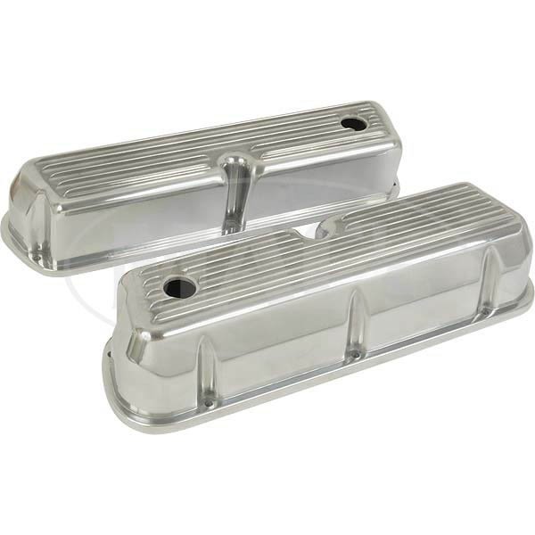 Beautiful new small block Ford aluminum valve covers features a tall fin design. These new valve covers will set you apart from the crowd! Manufacture in the usa to clear most roller rockers, baffles installed.