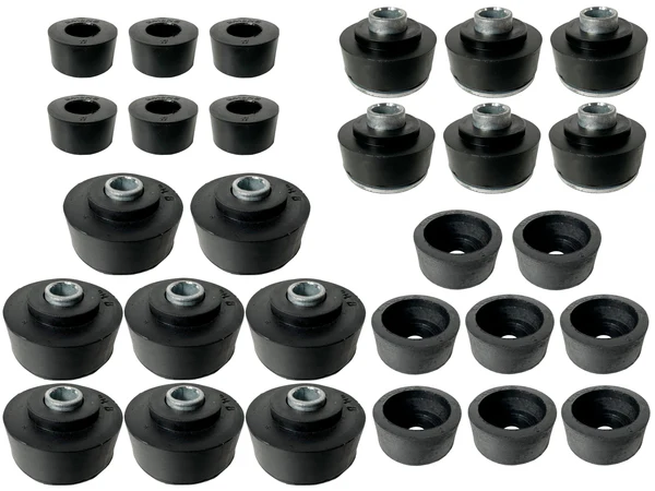 This body mounting kit contains all mounting bushings. It is correct S.B.R. compression molded with steel sleeve inserts. Bushing are made of high grade non recycled rubber.