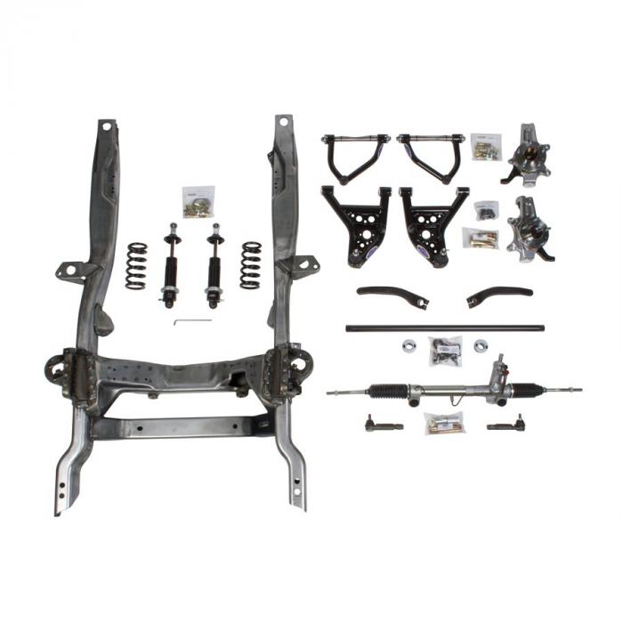 Up to a 10 Inch wide wheel can be packaged without modification to the inner wheel wells. Both the main and secondary crossmembers are stamped for structural rigidity. SBC, BBC, LS1, LS2, and LS7 engines have been designed as a direct bolt-in into this subframe.
