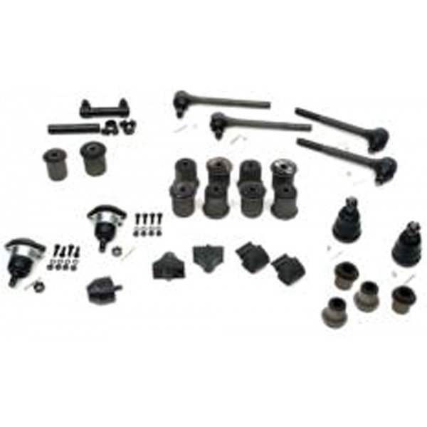 Replaces Worn Suspension Components Kit Includes Original Rubber Components And Upgraded Design Where Applicable Kit Includes: 2 Upper Ball Joints 2 Lower Ball Joints 2 Outer Tie Rods 2 Inner Tie Rods 2 Adjusting Sleeves 2 Front Upper Control Arm Bumpers 2 Front Lower Control Arm Bumpers 4 Front Upper Control Arm Bushings 4 Lower Control Arm Bushings 8 Rear Control Arm Bushings 1 Rear End Pinion Bumper Does Not Include Sway Bar Hardware, Idler Arm Or Center Link This Chevelle replacement front and rear suspension kit has been manufactured to meet or exceed factory specifications and performance. You will find the fit and function will work perfectly for your Chevelle.