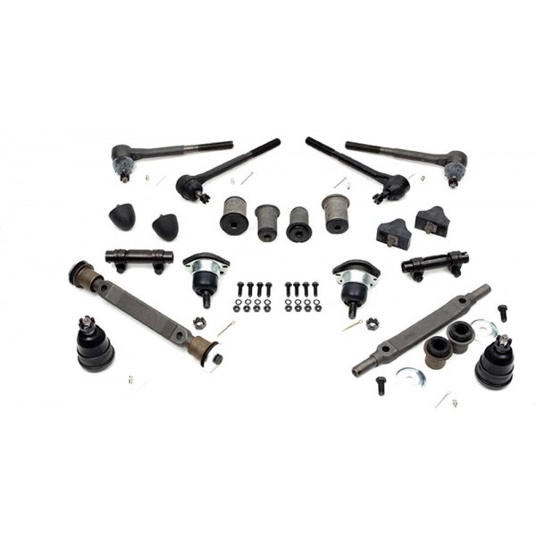 Replaces Worn Suspension Components Kit Includes Original Rubber Components And Upgraded Design Where Applicable Kit Includes: 2 Upper Ball Joints 2 Lower Ball Joints 2 Outer Tie Rods 2 Inner Tie Rods 2 Adjusting Sleeves 2 Upper Control Arm Bumpers 2 Lower Control Arm Bumpers 4 Upper Control Arm Bushings 2 Upper Control Arm Shaft 4 Lower Control Arm Bushings 1 Pitman Arm, 1st Design Front End Must Have a Lower Control Arm Bushings With A Large 1.90 And Small 1.67 Does Not Include Sway Bar Hardware, Idler Arm Or Center Link This El Camino replacement front end suspension kit has been manufactured to meet or exceed factory specifications and performance. You will find the fit and function will work perfectly for your vehicle. You will also be pleased to know that the El Camino Store has sourced this front end suspension kit among other possible parts as the best choice for your repair or restoration project.