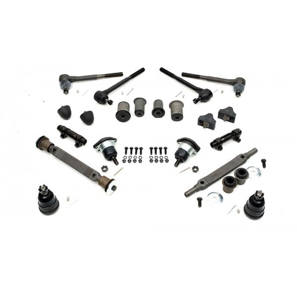 Replaces Worn Suspension Components Kit Includes Original Rubber Components And Upgraded Design Where Applicable Kit Includes: 2 Upper Ball Joints 2 Lower Ball Joints Outer Tie Rods 2 Inner Tie Rods 2 Adjusting Sleeves, 2 Upper Control Arm Bumpers 2 Lower Control Arm Bumpers 4 Upper Control Arm Bushings 2 Upper Control Arm Shafts 4 Lower Control Arm Bushings 1st Design Front End Must Have a Lower Control Arm With Large 1.90 And Small 1.67 Bushing Does Not Include Sway Bar Hardware, Idler Arm Or Center Link This El Camino replacement front end suspension kit has been manufactured to meet or exceed factory specifications and performance. You will find the fit and function will work perfectly for your vehicle. You will also be pleased to know that the El Camino Store has sourced this front end suspension kit among other possible parts as the best choice for your repair or restoration project.