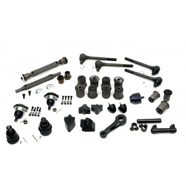Replaces Worn Suspension Components Kit Includes Original Rubber Components And Upgraded Design Where Applicable Kit Includes: 2 Upper Ball Joints 2 Lower Ball Joints 2 Outer Tie Rods 2 Inner Tie Rods 2 Adjusting Sleeves 2 Front Upper Control Arm Bumpers 2 Front Lower Control Arm Bumpers 4 Front Upper Control Arm Bushings 2 Upper Control Arm Shafts 4 Front Lower Control Arm Bushings 1 Pitman Arm, 8 Rear Control Arm Bushings (Uppers & Lowers) 2 Rear End Bumpers 1 Rear End Pinon Bumper (72 only) Must Have Lower Round Front Control arm Bushings Does Not Include Sway Bar Hardware, Idler Arm Or Center Link This El Camino replacement front and rear suspension kit has been manufactured to meet or exceed factory specifications and performance. You will find the fit and function will work perfectly for your vehicle. You will also be pleased to know that the El Camino Store has sourced this front and rear suspension kit among other possible parts as the best choice for your repair or restoration project.