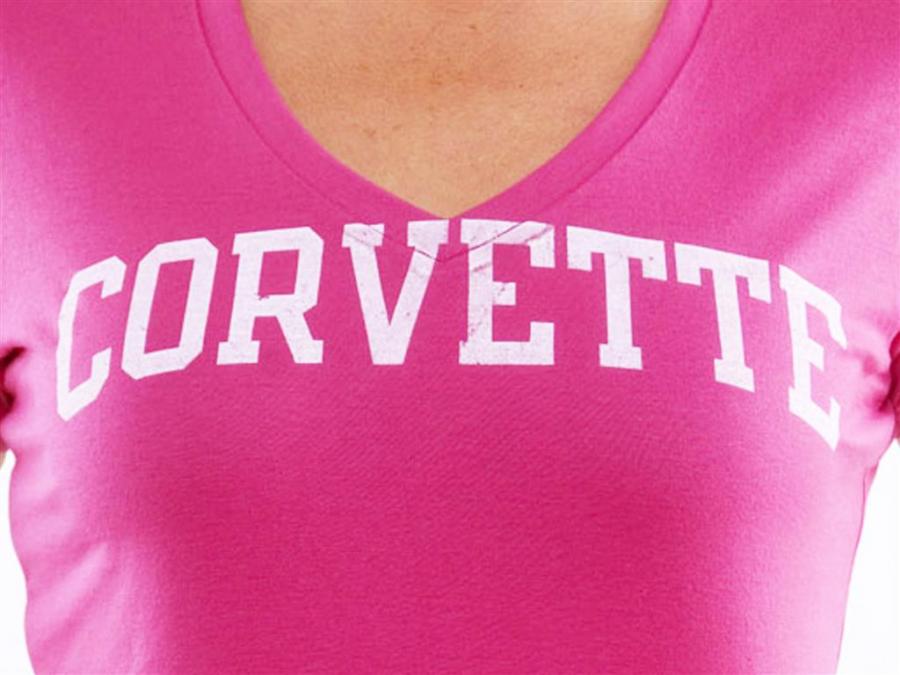 Champion 100% cotton lightweight Jersey V-neck Tee. Arched Corvette lettering across the front in a distressed screen print give this shirt a young, modern feel.