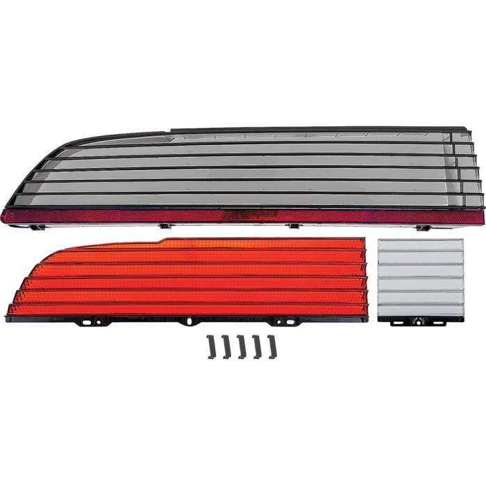Meticulously manufactured to exact specifications replicating the original tail lamp lens in every detail! Features correct OEM factory markings on each lens for complete authenticity. Each complete assembly includes the inner stop lamp lens, inner clear back-up lens, outer smoked tail lamp lens, and 5 retaining clips for installation. All lenses are painted with correct black accents as original. Sold individually. Pre-packaged in a specially designed corrugated box to ensure safe delivery.