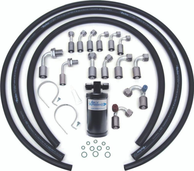 Includes drier and mounting clamps adequate hose length to connect most universal systems 14 assorted O-ring fittings and refrigerant oil. Includes 135° compressor fittings with service ports and firewall bulkhead fittings. Includes 6 ft. of # 6 barrier hose 4 ft. of # 8 barrier hose and 5 ft. of # 10 barrier hose. Extended length kits are also available.