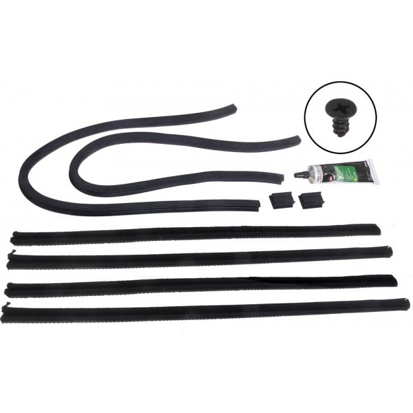 The kits include upper window sponge seals, T shaped anti-rattle rubber (when required), lower glass cushion bumpers & adhesive. Each piece has specific applications, this is not a general mix of pieces.