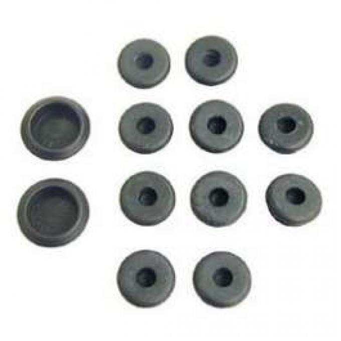 Rubber and plastic body plugs for floors, trunk extensions and rear outer wheel wells. Set of 12.