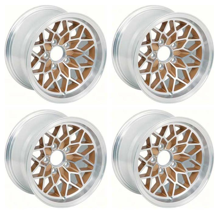 Reproduction of the original cast aluminum "Snowflake" wheels designed for use with 1978-81 Pontiac Firebird and Trans Am models. This wheel set was originally part of the WS6 option package on 1978-81 Trans Am models. Each set has gold painted inserts and is finished with a clear coat as original. Features 4-1/4" backspacing and 5 x 4-3/4" bolt pattern. Wheel weight is 24 lbs.