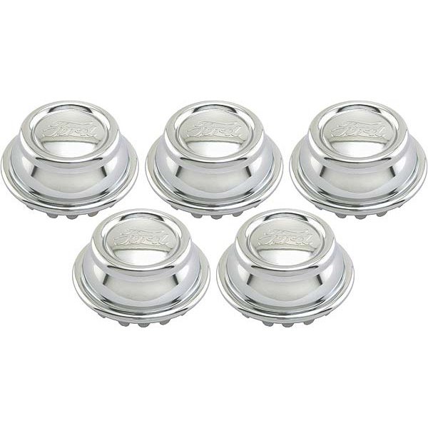 Model A Ford Hub Cap Set - 5 Pieces - Chrome Plated - Ford Script - Fits 2-5/8 Rim Opening - Show Car Top Quality
