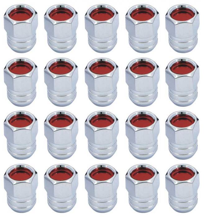 Reproduction of the original Pontiac Rally II wheel lug nuts for use with various 1967 Pontiac models. These lug nuts are manufactured to correct factory dimensions, 7/16" - 20 replacing the old or worn out original lug nuts exactly. Set of 20 lug nuts.