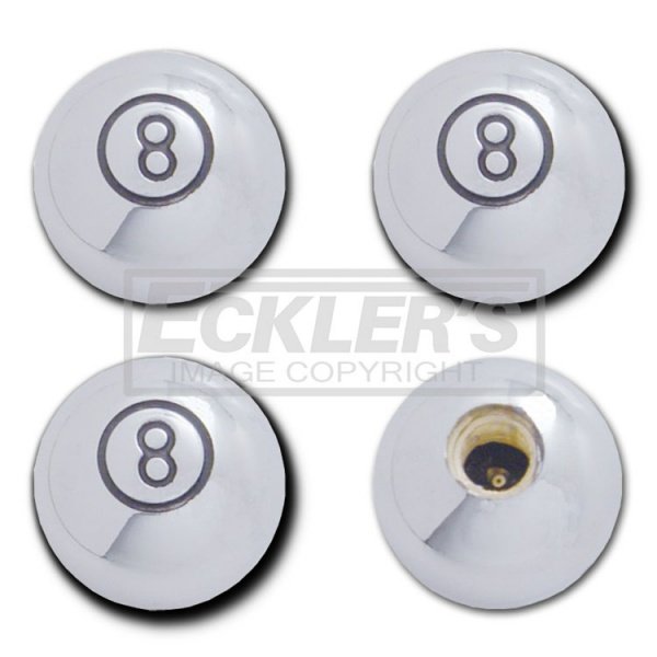 Great Retro Accessory! High Impact Plastic Die Body Brass Valve Stem Fitting Set Of 4 1-1/32 Diameter Chrome Plated Pool or Pocket Billiards has been a popular game forever, especially 8-ball. Putting a set of Eight Ball valve stem caps on your El Camino shows that you are willing be a little dangerous! The El Camino Store brings you a great accessory for your 1959-1987 El Camino, Cabellero ,or Sprint to make it stand out from the crowd. This set of 8 Ball valve stem caps look great in chrome and the high-impact plastic body wraps around an all brass fitting for durability. Trust The El Camino to bring you the best parts at the best possible price. Fits: 1959, 1960, 1961, 1962, 1963, 1964, 1965, 1966, 1967, 1968, 1969, 1970, 1971, 1972, 1973, 1974, 1975, 1976, 1977, 1978, 1979, 1980, 1981, 1982, 1983, 1984, 1985, 1986, 1987